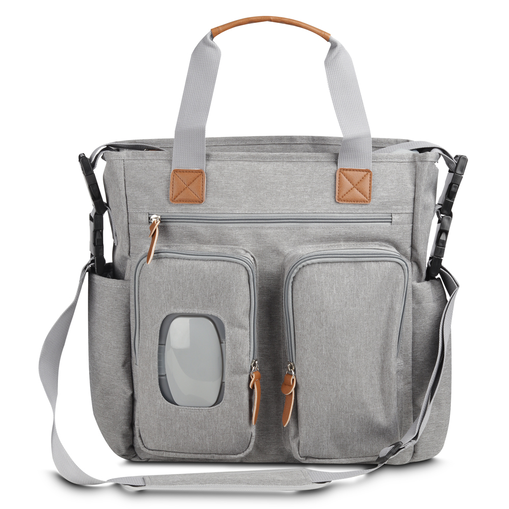 Mochila funcional em poliéster e couro sintético, compartimento com divisórias, alça de ombro e mão, 4 bolsos laterais.