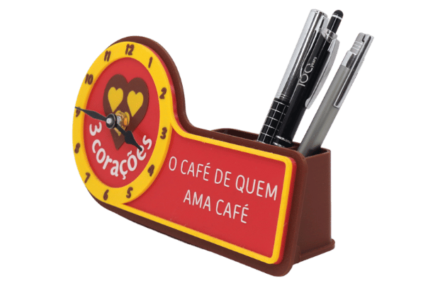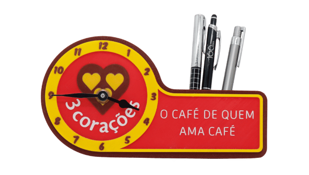 Relógios de mesa com porta-canetas em impressão 3D com PLA biodegradável, unindo praticidade e sustentabilidade.